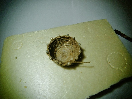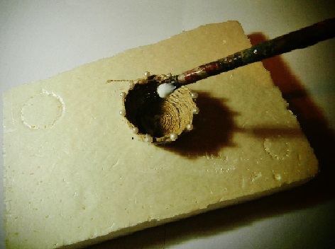 * Si ya tenemos colocada la base en el fondo del cesto apretamos los alfileres hacia abajo para que quede bien fija y encolamos con cola y pincel todo el interior. ES MUY IMPORTANTE NO MOJAR CON AGUA EL PINCEL NI DILUIR MUCHO LA COLA, pues si se humedece mucho la cuerda se hinchará y no quedará tan bonito.