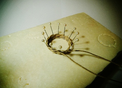 *En segundo lugar distribuímos cuatro alfileres de cabeza gruesa de forma simétrica como si fueran los puntos cardinales (Norte, Sur, Este y Oeste) y posteriormente intercalamos dos alfileres más en cada cuarto de la circunferencia. ( la inclinación de los alfileres determinará la anchura de la boca de la cesta).