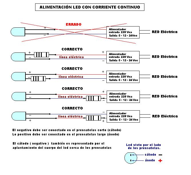 ALIMENTACIIÃN LED CON CORRIENTE CONTINUO.JPG (67KB - 311 descargas)Hola.-Creo entender que para los leds de alta luminosidad conectados a traves de un transformador de corriente contiua estabilizada de entrada 220 v. y salida a 12 v. debe colocarse en el led una resistencia de 560 omios en el ánodo (positivo), bien en el mismo led o sobre la linea .