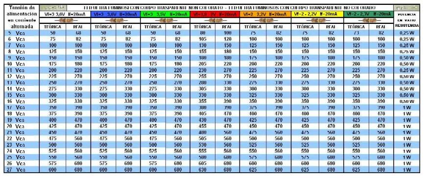 Os alego las mesas, hasta a ahora elaboráis, que se refieren al valor de resistencia que montar en serie al led en función a: tipo, color y tensión de alimentación, en corriente continua, que queréis utilizar.