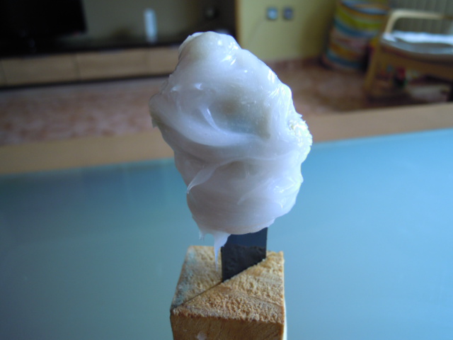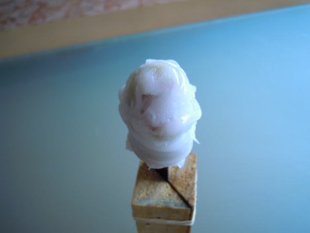4º) Una vez que la figua que vamos a copiar esta impregnada de aceite multiusos (no en exceso) se le van añadiendo capas de la mezcla de silicona y quitaesmalte, la primera aplicarla con una brochita y poner cuidado de que quedan todos los lugares de la figura bien cubiertos ya que de esto dependera que la copia que vamos a hacer quede con todos los detalles que tiene el original, por lo que os aconsejo que en esta primera capa sea lo bastante fina para cubrir todo por completo.