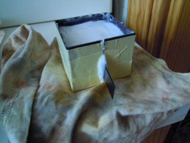 7º) Una vez que tengo el molde lleno de escayola o yeso, introduzco el mode en una bolsa de plastico y lo hago girar en el aire para que la fuerza centrifuga haga que las burbujas de aire que pueda haber en el molde salgan.