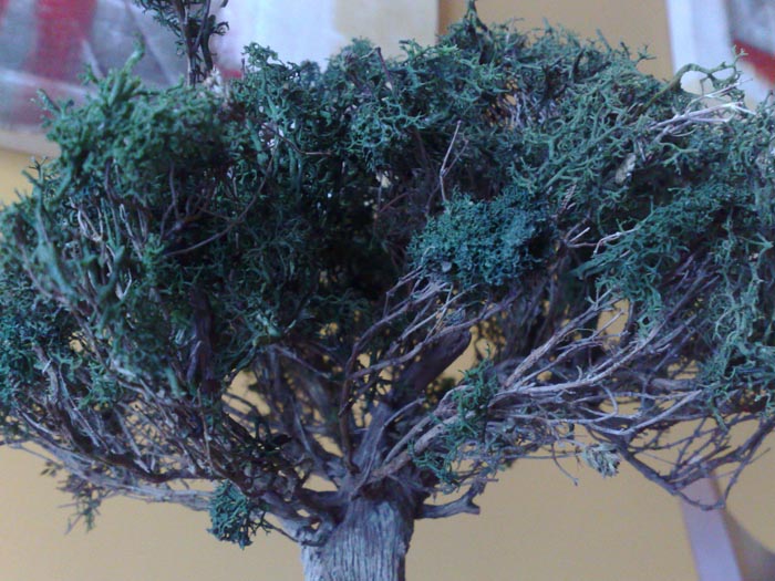 10º Introducimos el liquen en el agua con cola y lo colocamos como sobre las ramas como si fuese una sabana, esto hay que repetirlo hasta cubrir toda la copa.(Dejamos secar)