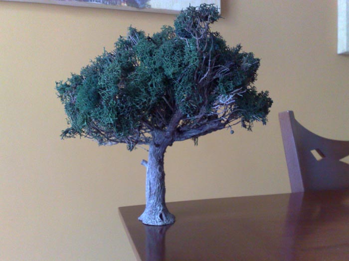 14º Repintamos el tronco y los detalles del mismo ya que la disolución agua cola del liquen chorrea por todos lados y como el liquen de origen es blanco, los verdes tienen un tinte que lo arrastra por todo el tronco)
