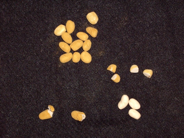 Su realización es bastante sencilla. En primer lugar hacemos unas bolitas de fimo, color beige de forma irregular de unos 6 o 7mm. En un recipiente, yo utilizé una flanerita, echais un poco de canela en polvo y echais allí las bolitas, reservando unas cuatro o cinco. Agitais el recipiente para que que se impregnen de la canela y las sacais. Con la ayuda de un cutter, mondais unas cuantas y otras las partis directamente por la mitad.