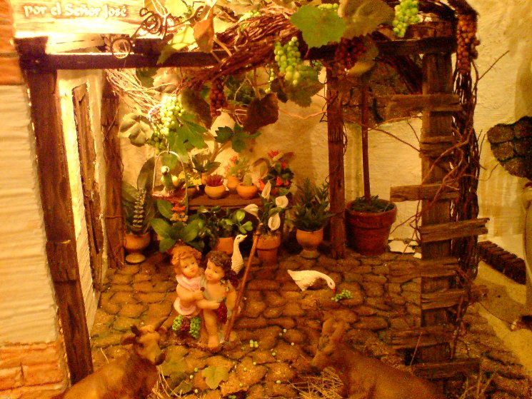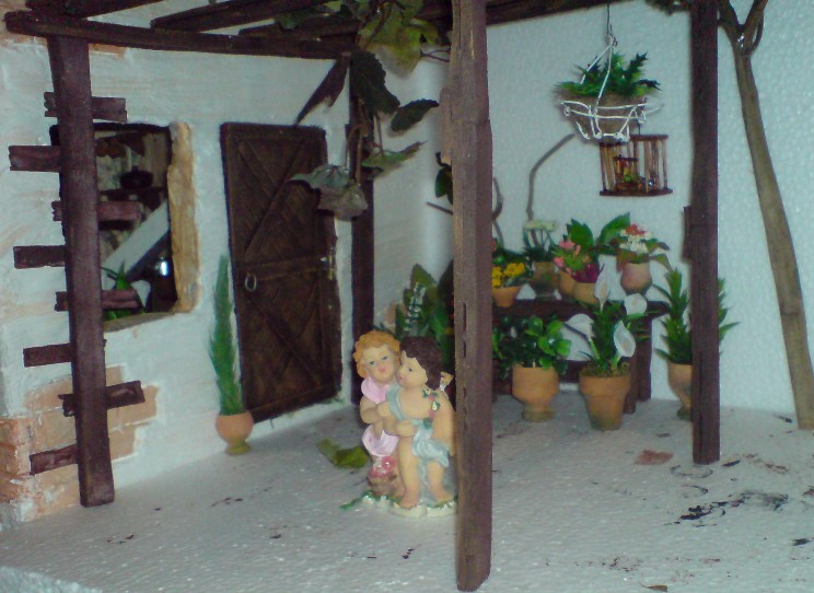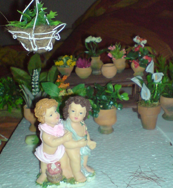 de igual manera quiero su consejo aserca del Patio, les explico como se ve el la segunda foto esta la puerta de salida hacia el patio en el cual estara una enredadera de Parra y los niños estos estaran con uvas en las manos y en la cestica que llevan en los pies, mi dilema es el piso del patio, lo hago de musgo estilo grama o un suelo empedrado, pienso que si lo hago de musgo el detalle de la mesa con las plantas se pierde un poco y por otro lado si lo hago empedrado necesito como cerrar el final donde termina el piso y no se como porq no quiero ponerle paredes ni nada para que se puedan apreciar todos los elementos :(  ¿que hago?