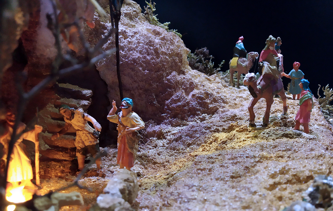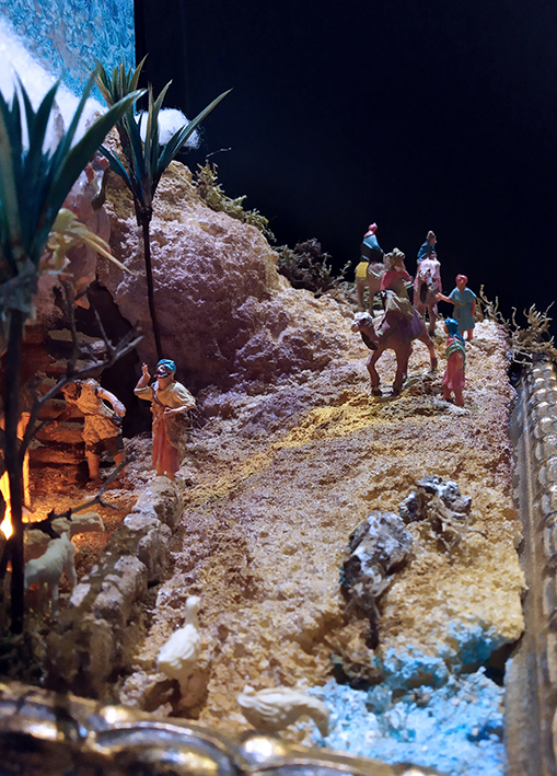 Es un pequeño belén para regalar estas Navidades, está montado sobre un marco de 23×30cms., realizado con poliestireno expandido y espuma de poliuretano, el color con una base de spray, acrílicos y pigmentos. Las figuras son de h. Pech de 3 y 5cms.