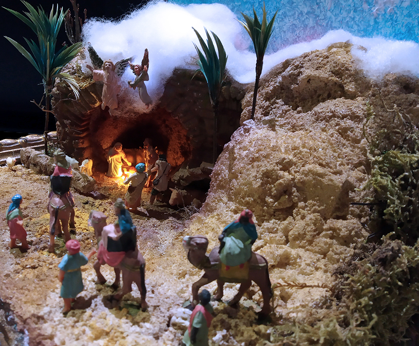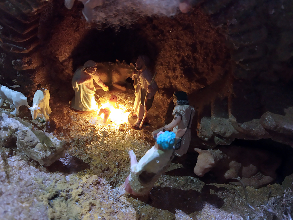 La iluminación para recrearla, utilicé leds, para la niebla de los ángeles tres de luz blanca y dos rojas y para el niño Jesús una cálida.