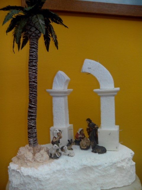 Aquí os dejo otro trabajillo, esta vez un pequeño pesebre de 22 cm de ancho, 14 de fondo y 29 de alto. Esta hecho con corcho del blanco y del extruido (denso). Las figuras son de 5 cm.. La Base es de corcho blanco de 5 cm. pintada con pitura de revestimiento de fachada rugosa y tallada con la técnica del disolvente.
