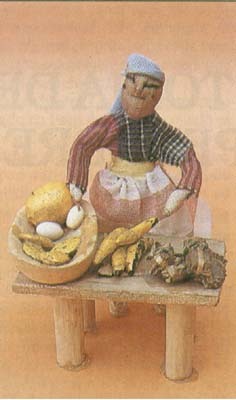 En nuestro siglo pasado y principios del actual, las abuelas, ya licenciadas de sus funciones de madres y educadoras, y recluidas en los oratorios, las cocinas y los cuartos de costura, se entregaron alegremente a la tarea de copiar lo que las rodeaba: campesinos en sus sembrados, arrieros con sus caballerías, revendedoras del mercado, serenateros con sus instrumentos, cuanto les pareció adecuado y de mayor colorido. Los retazos que sobraban de los trajes de la familia suplían sus necesidades, junto con las medias de seda retiradas de la circulación, que servían para confeccionar brazos y caras, y cuyos hilos estirados formaban los cabellos (lo que ahora resulta imposible: el nylon no se presta para ese resultado). Con carbón de palo se reteñían los ojos y los picos de las aves de corral. Sembrarlas de plumas no era empresa fácil. Exigía horas seleccionar las saraviadas, negras tornasoles o amarillas brillantes, de curva apropiada para incrustarlas en el preciso lugar anatómico, pegándolas cuidadosamente con almidón a fin de tapar los menudos cañoncitos. Y estaban las ovejas de algodón apelmazado, con el inevitable cordero perdido y hallado, abrazado tiernamente al cuello de su pastor.