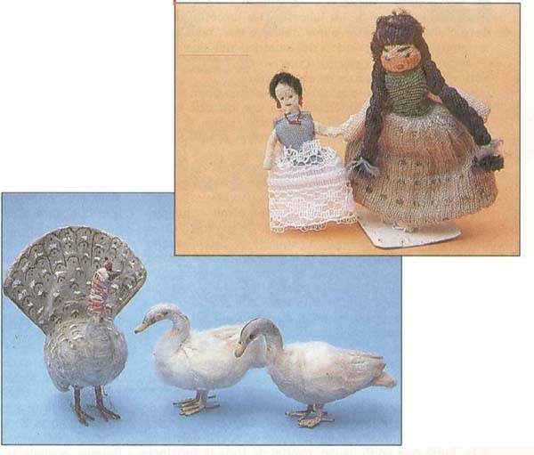 Foto 8 y 9: Una "muchacha del servicio" y una "niña de familia", figuritas de un pesebre de comienzos de siglo. Pavo y patos confeccionados con trapo y plumas para un pesebre de comienzos del siglo XX