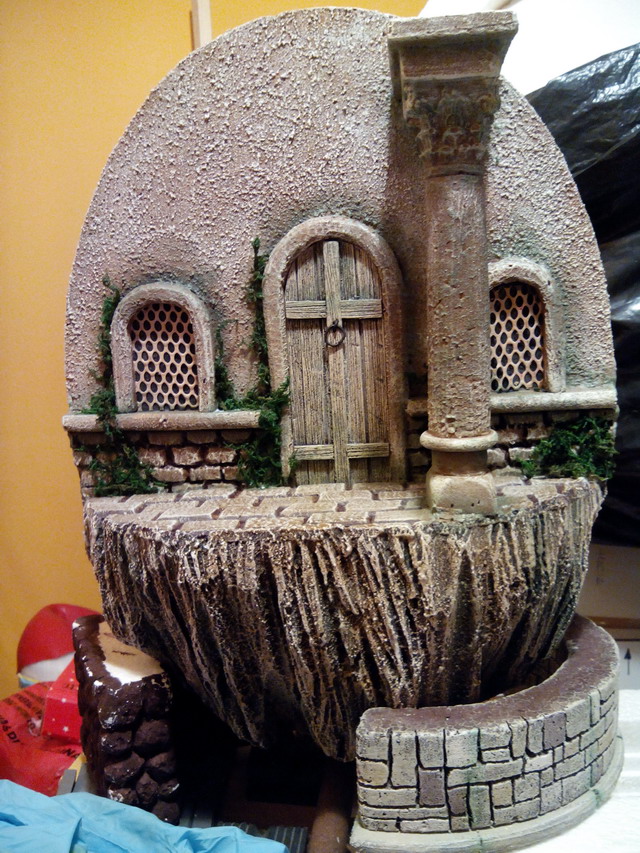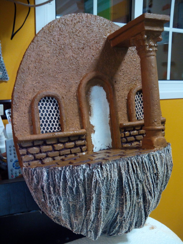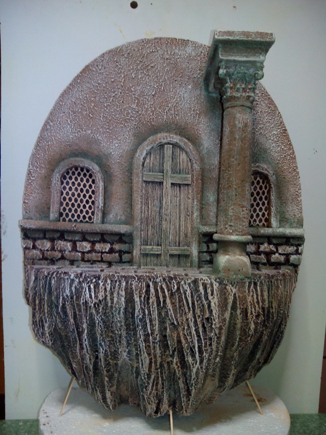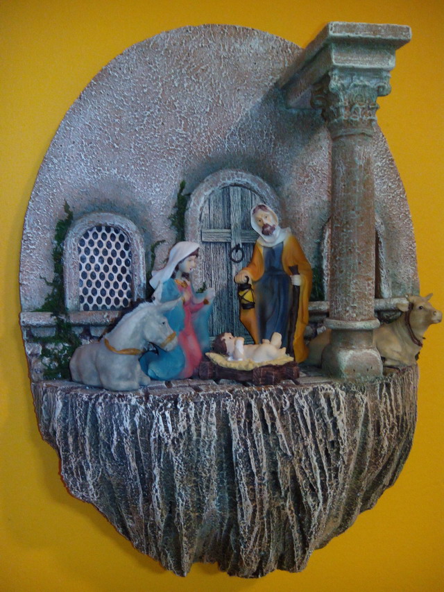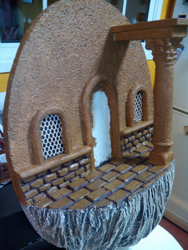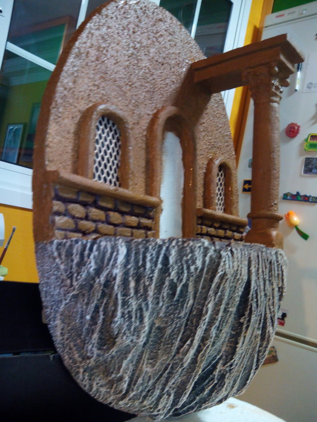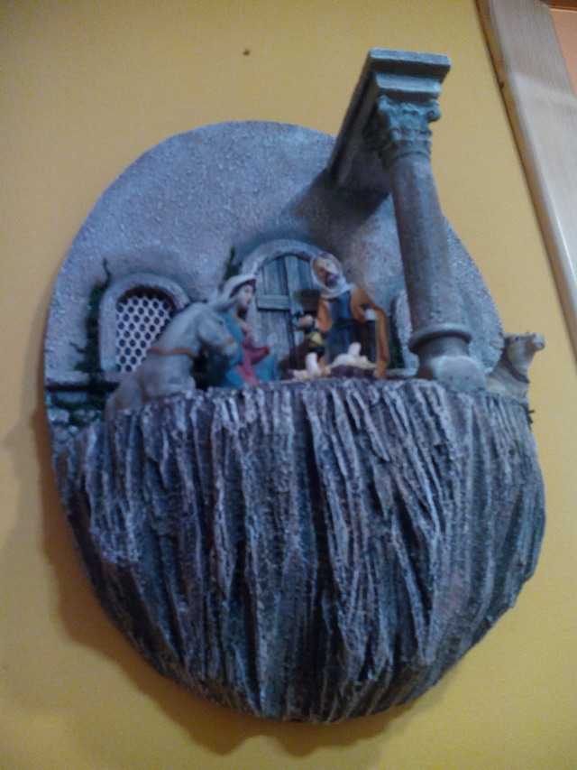 Aqui os traigo otro trabajo para este año 2014, se trata de un Pesebre para colgar de estilo Romanico. Está hecho todo en corcho blanco y pintado con pintura de revestimiento de fachada rugosa. Las figuras son de 11 cm.
