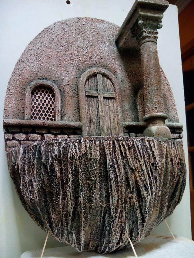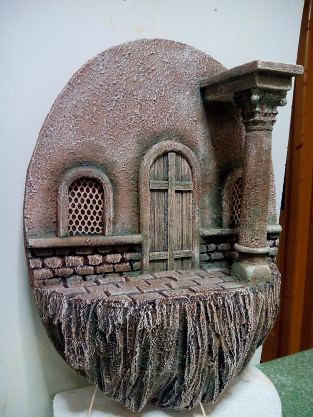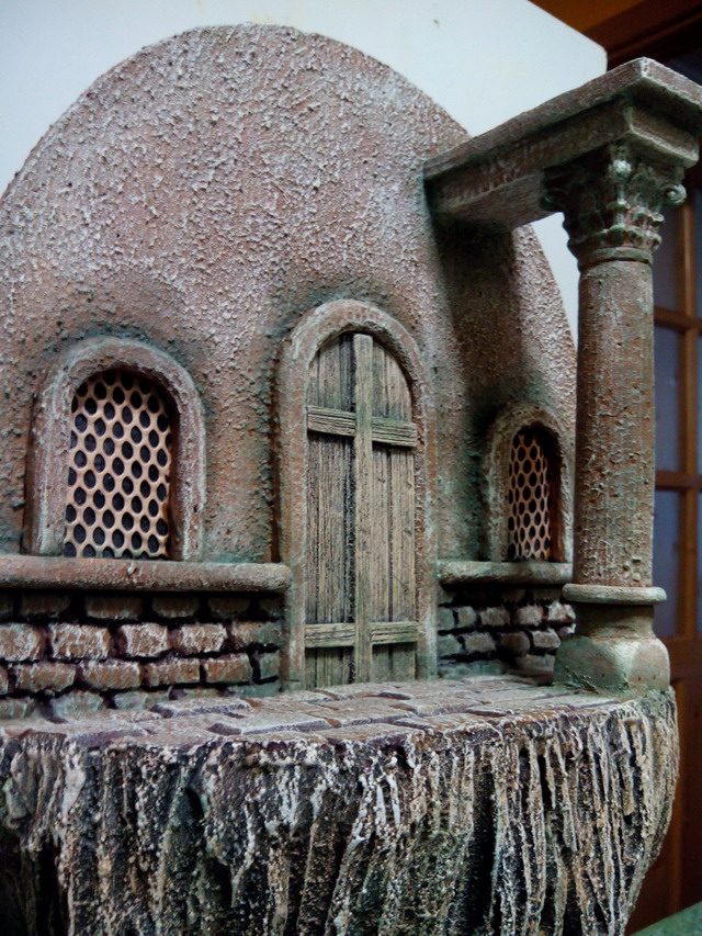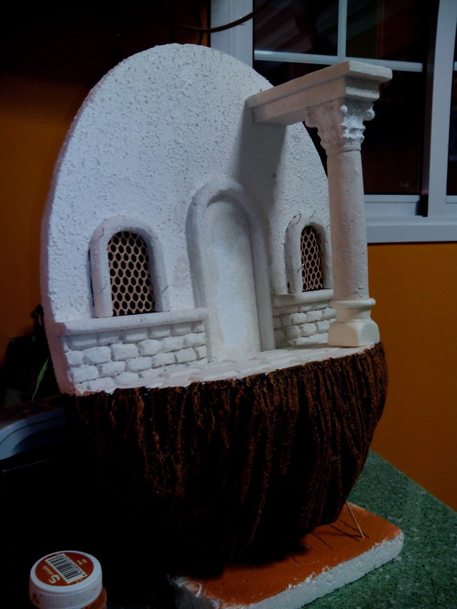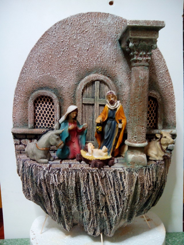 Aqui os traigo otro trabajo para este año 2014, se trata de un Pesebre para colgar de estilo Romanico. Está hecho todo en corcho blanco y pintado con pintura de revestimiento de fachada rugosa. Las figuras son de 11 cm.