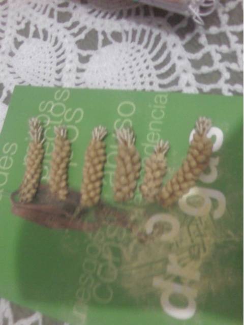 En los pinos piñoneros, que creo que habra por toda España, porque los pone el ayuntamiento por los parques, jardines, plazas, calles..., en estas fechas estan saliendo las nuevas piñas, pues las cogemos y como son largas, le cortamos con unas tijeras por la mitad y la parte que tiene la zona verde parece unas piña. Hos pongo unas fotos, porque no me he esplicado muy bien.