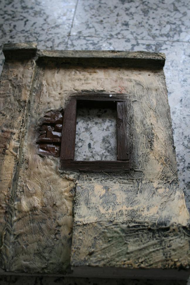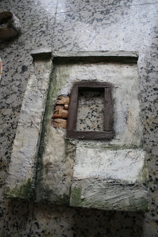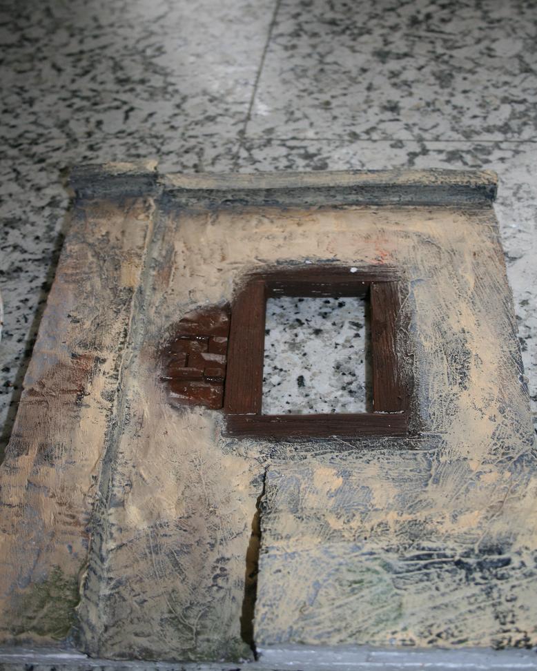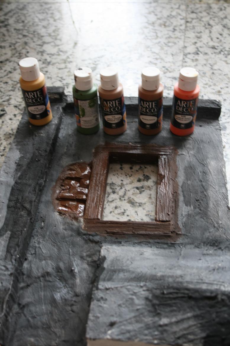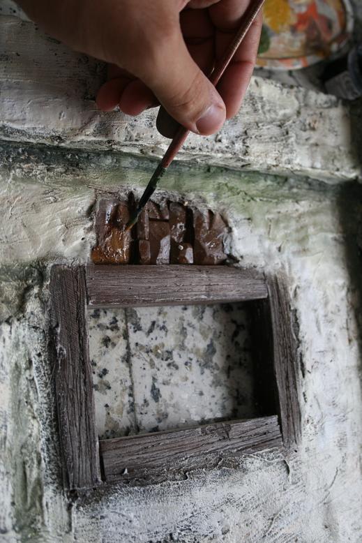 Vemos los tonos quevamos aplicar en el desconchon, intentando que cada sillar tenga un tono diferente, el marron debe estar seco, ya que pintamos directamente sobre el corcho de color el cuál no absorve tanto la pintura y tarda mas secar, de hecho en las fotos anteriores los sillares se ven brillosos señal de que no estan secos.