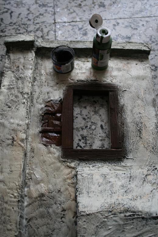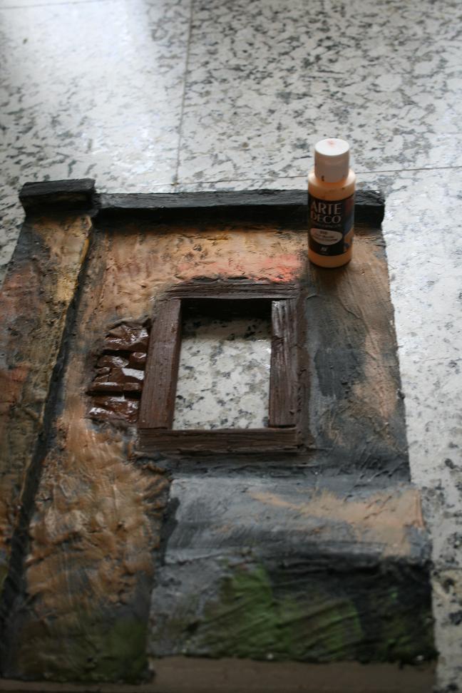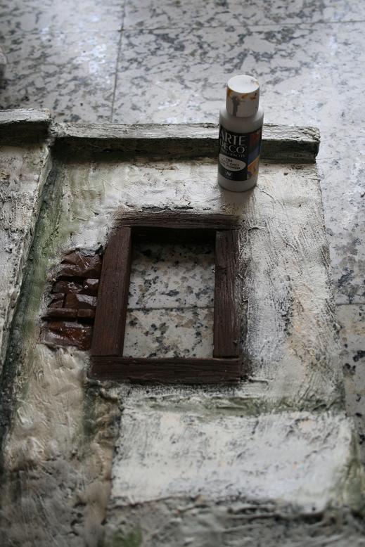 Una vez aplicado el tomo crema le vamos aplicar las humedades con negro y vrde muy aguado, ya que como sabeís las veladuras anteriores son con la pintura tal cual sale de tarro.