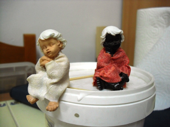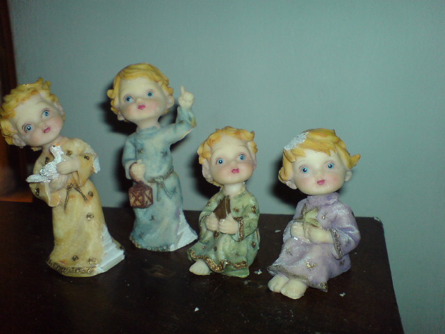 Entelado pintado 4.JPG (157KB - 283 descargas)Toniato Hoy he Salido y entrado a unos Chinitos y me acorde de ti al ver unas figuras de angelitos muuy buenas y que te vendrían de Maravilla lastima que estes tan lejos vienen en duo uno parado y otro sentado me los he comprado para ponerlos este año en mi belen lo bueno es que ya estan vestidos con sus tunicas solo es cuestión de pintarlos te adjunto una foto quien quita y visites algunos chinos y los encuentres, Un saludo.