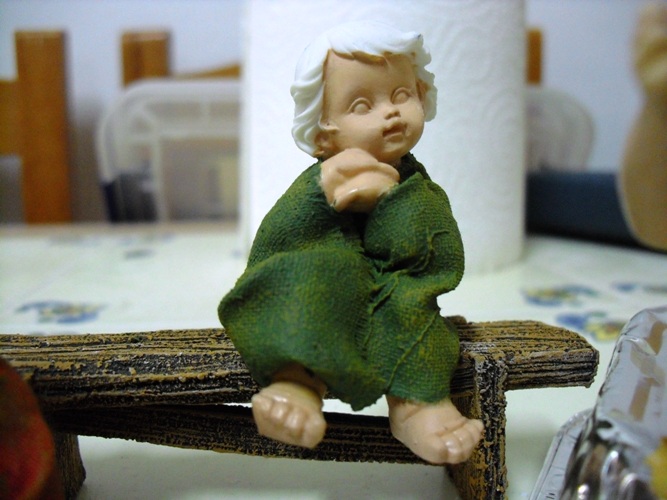 Las del niño jesus creo que podrian quedarse tal y como estan pintadas, solo vestirlas y modificarlas un poco para que se mantengan sentadas, no le veo mucho problema. El problema es la pintura y la ropa de los otros.