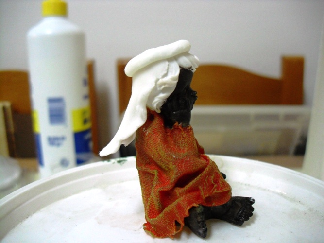 Las del niño jesus creo que podrian quedarse tal y como estan pintadas, solo vestirlas y modificarlas un poco para que se mantengan sentadas, no le veo mucho problema. El problema es la pintura y la ropa de los otros.