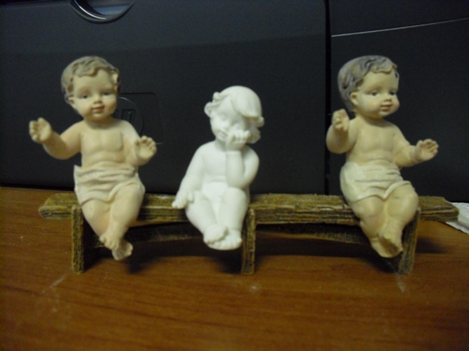 Toniato Hoy he Salido y entrado a unos Chinitos y me acorde de ti al ver unas figuras de angelitos muuy buenas y que te vendrían de Maravilla lastima que estes tan lejos vienen en duo uno parado y otro sentado me los he comprado para ponerlos este año en mi belen lo bueno es que ya estan vestidos con sus tunicas solo es cuestión de pintarlos te adjunto una foto quien quita y visites algunos chinos y los encuentres, Un saludo.