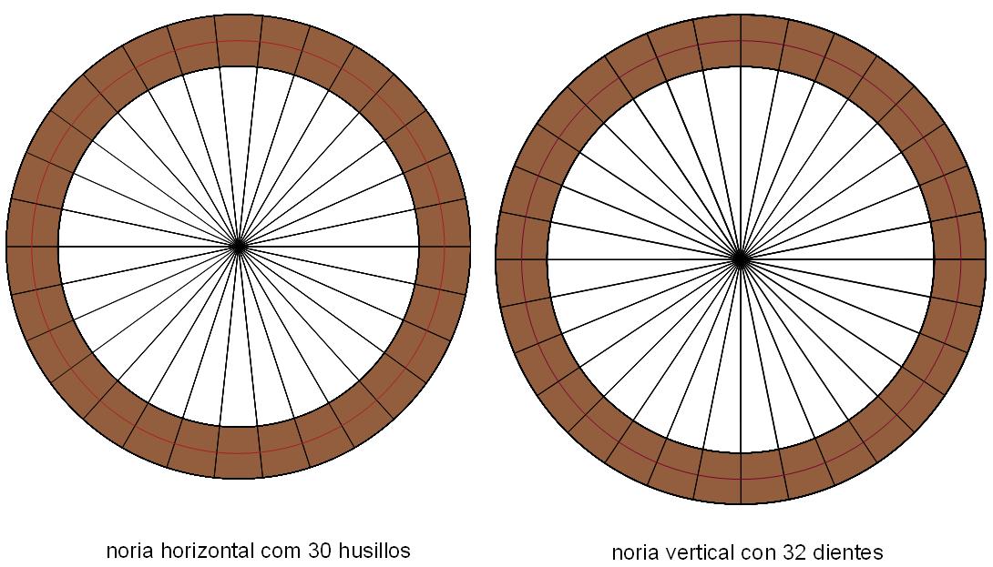 . La noria tiene movimiento a través de un motor de 3 rpm que está instalado en la parte baja del eje de la noria horizontal (por debajo de la base de la noria), que la hace girar y ésta, a su vez, a la noria vertical.