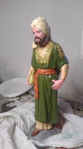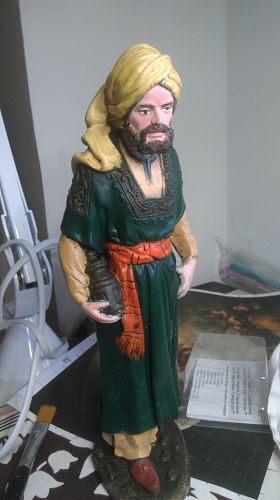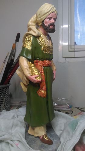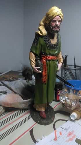 Fue una gran ilusión encontrarme esta figura en el escaparate de la tienda de pinturas. Observe que era una replica modificada del maestro JL M y no pude evitar comprarla y al llegar a casa me puse a pintarla imitando los colores de su catalogo. Aquí os la muestro. Ahora estoy con el gusanillo de pintar los otros dos reyes y buscar un misterio que se acople a estas figuras. Espero os guste