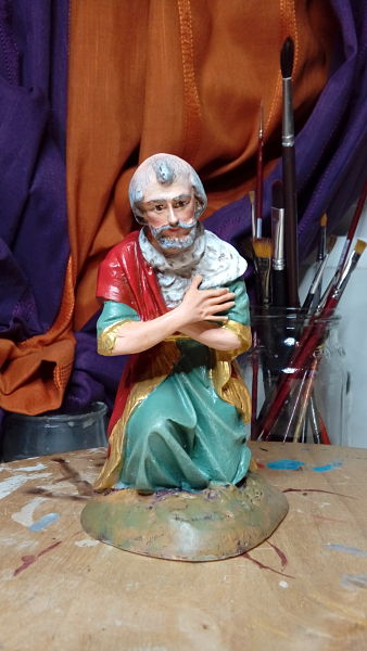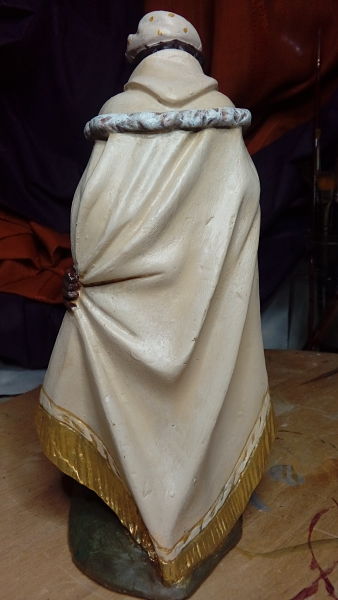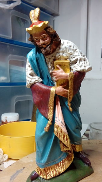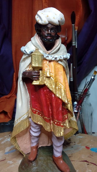 Hace un tiempo conseguí los tres Reyes en adoración, de 20 , en marmolina imitación los de la escuela de Olot y aquí os muestro el primero que he pintado. Conforme los acabe de pintar os enviare mas fotos. Espero os gusten.
