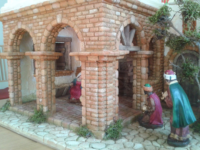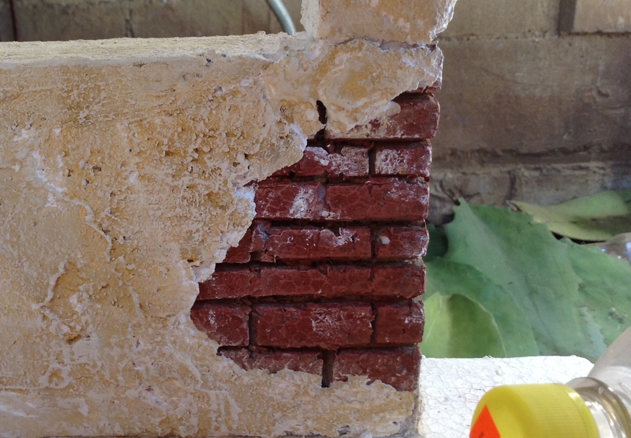 Lo que yo hago es poner una base de color oscuro aguado para cubrir toda la superficie, después le doy una veladura de color rojo óxido procurando no pintar las endiduras de los ladrillos, una vez seco le doy otra veladura a pincel seco de color terracota y al final unos toques con pincel seco de color blanco pero muy poco en alguno que otro lugar y quedan así: