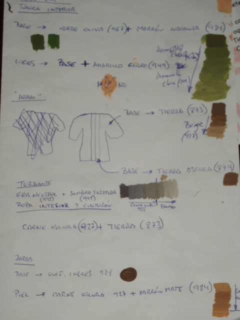 sobre el tema de los esquemas de colores me parece una buena idea eso de realizar antes uno para ver como enlazan entre si, lo que pasa es que yo voy realizando el esquema segun voy pintando la figura, osea yo pienso el color que le voy a aplicar y despues pinto un pequeño recuadro indicando la pintura utilizada para realizar la mezcla, mas bien tengo estos esquemas como recordatorio para futuras figuras, de todas formas me parece muy buena tu idea.