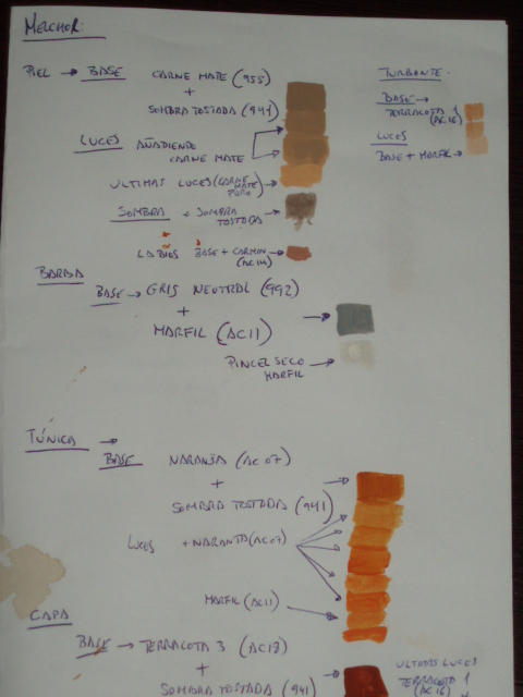 sobre el tema de los esquemas de colores me parece una buena idea eso de realizar antes uno para ver como enlazan entre si, lo que pasa es que yo voy realizando el esquema segun voy pintando la figura, osea yo pienso el color que le voy a aplicar y despues pinto un pequeño recuadro indicando la pintura utilizada para realizar la mezcla, mas bien tengo estos esquemas como recordatorio para futuras figuras, de todas formas me parece muy buena tu idea.