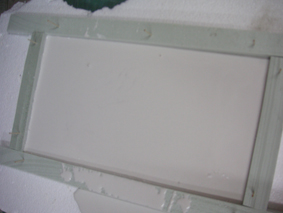 hice el marco con trozos de porexpan a modo de marco. Los sujete con simples palillos. Esto lo sujeté a una placa de porexpan estruido (del duro, vamos). Tambien sujeto con palillos. A la superficie la unté con un poco de nivea (para que no se pegue la escayola) Vertí la escayola no muy liquida. Y deje secar. Retiré con cuidado los laterales y luego con una espatula pase con cuidado por debajo. Y si la crema ha funcionado bien no tendras mucho problema...