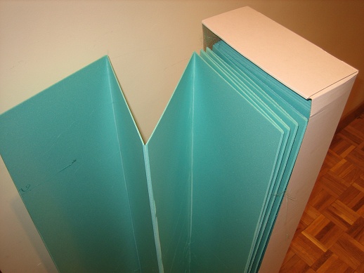He comprado polietireno extruido de 2.2 milímetros (12 m2:15€, que ya está bien). Viene en una caja muy cómoda de transportar y es extruido de verdad (color verde). Viene empaquetado en una sola pieza en forma de acordeón. Para los que estén interesados, lo tienen en la sección de parquets (no en construcción) y se llama Subcapa Ecorápida . El siguiente grosor de extruido que tienen es el de 3 cm.