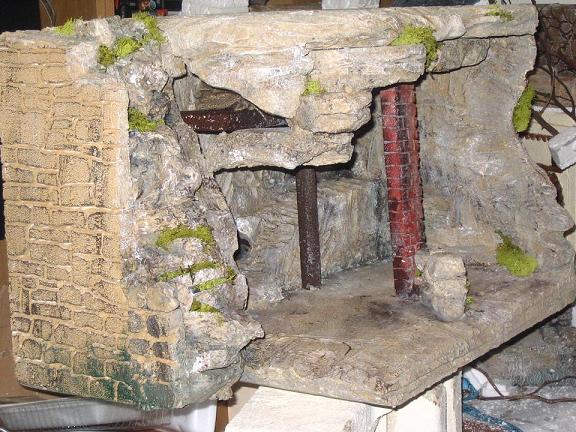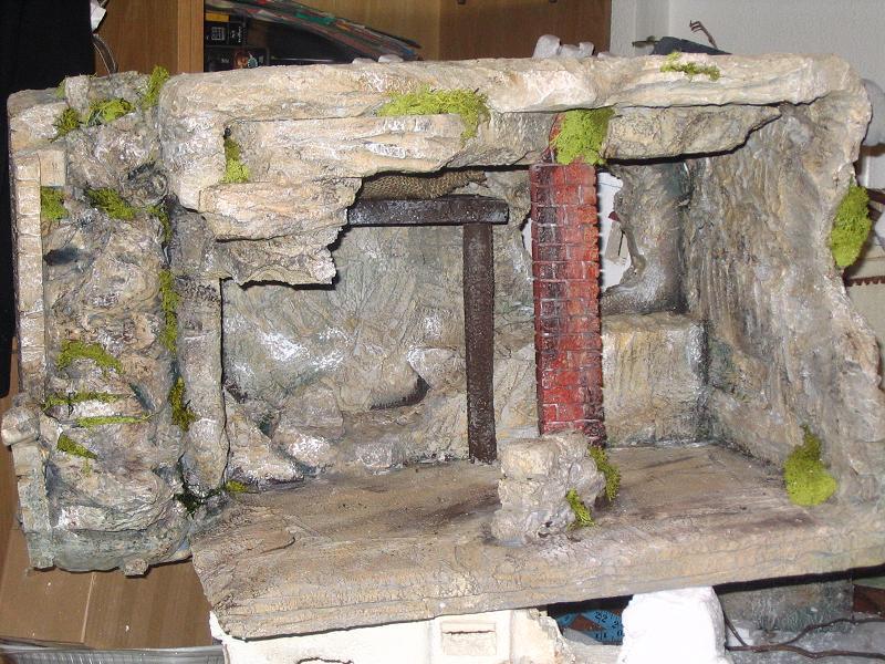 Bueno en principio era una gran caja del corcho que protegía ciertos medicamentos que llegan a la farmacia de mi hospital ( no sabeis bien el chollo que tengo yo con esto para la adquisición de este material......)Recorté de manera irregular un lado y el techo y fuí pegando otros trozos del porex para formar unas rocas.En principio probé a poner una especie de pajar al lado derecho,aunque luego ví que me quedaba mejor para el otro lado y cambié de idea