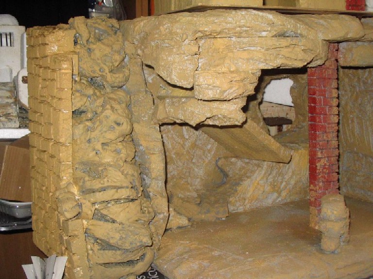 Luego he ido pintando sucesivamente en un color gris,ocre,pasadas con el pincel seco de blanco y ocre,aldo de verde en algunos sitios para semejar humedad y negro o marrón en huecos para dar especie de sombra u oscuridad.