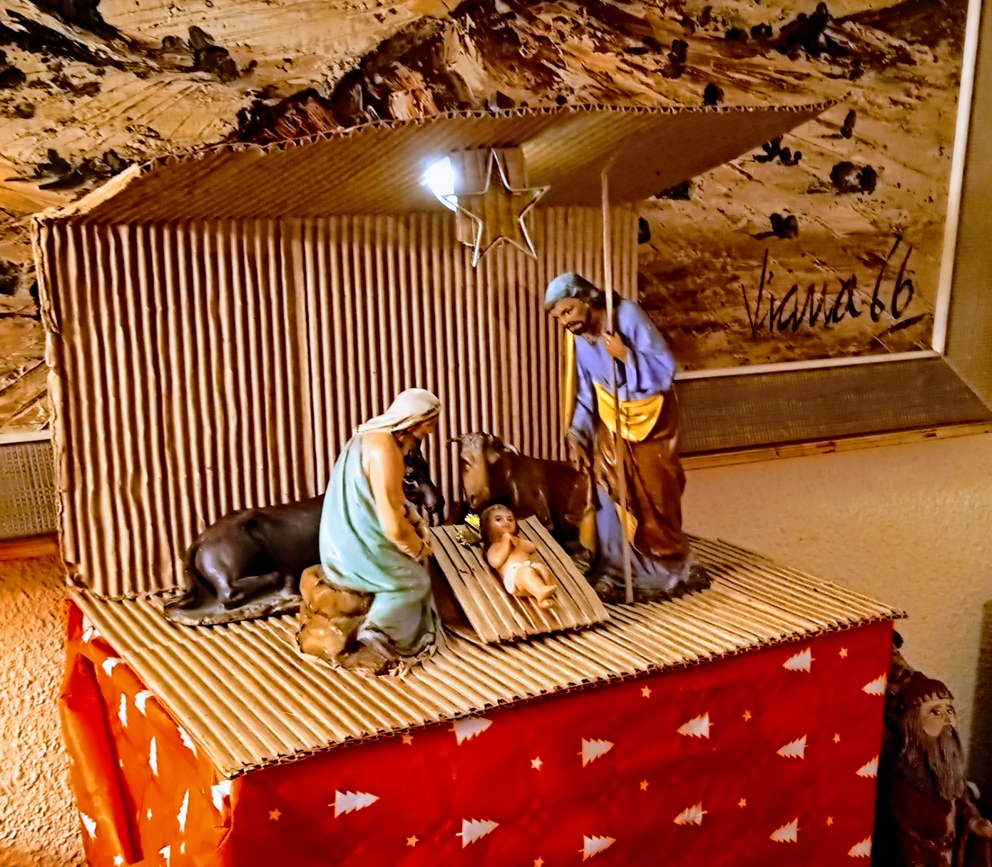 Con tanto belén en parroquia y el de casa, no tuve tiempo para la de mis suegros y antes de la cena de Nochebuena había que intentarlo y salió esto para la entrada, a veces lo que cuenta es la intención, es un portal muy sencillo y más que express es de 'sobre la marcha', con lo que había y con el tiempo encima, un cartón ondulado, pegamento y una bombilla LED...idea rápida un pliegue y todo con ese material, hasta la vara de San José, os podría echar un rollo conceptual, no lo haré😅...eso sí reciclable, de quita y pon, con un poco de imaginación marquesina-portal para la Nochebuena.
