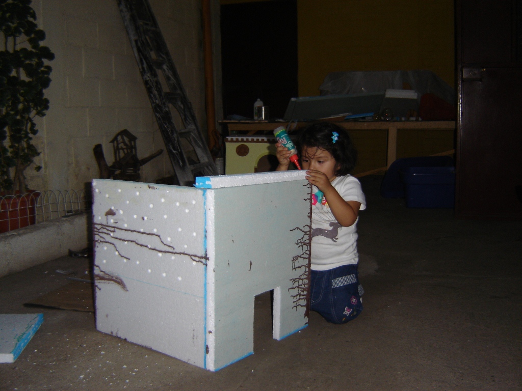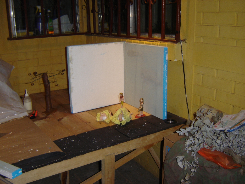 Pues bien, mi diseño como siempre es muy sencillo utilizando retazos de porexpan de bolitas (sólo este he visto en mi país y le llaman duroport), son para aquellos que como yo, son neófitos en este mundillo que me fascina… pero necesitan partir de algo. Lo más importante de este trabajo fue mi ayudante, aunque como verán, se le olvidó quitarle la tapa al silicón, pero me gusta que me ayude para que el amor por reconstruir el acontecimiento más grande e importante del Universo no muera