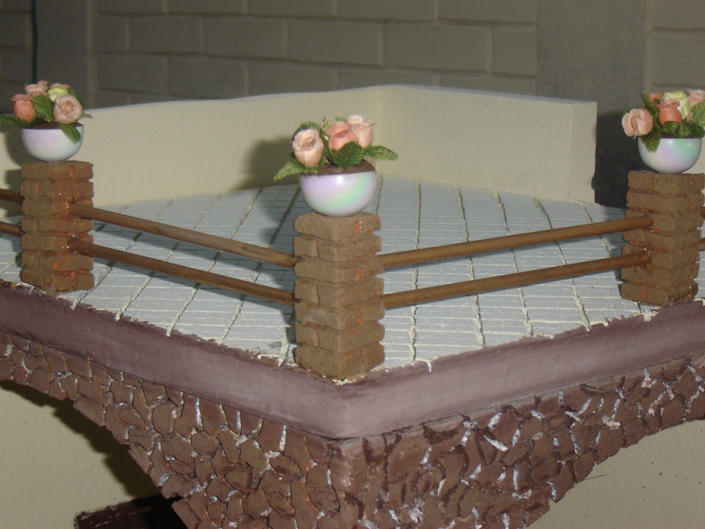 Lo que simula la tierra de las macetas es plastilina, las masetas eran unas copas de recuerdos matrimoniales y las flore de tela, todo comprado con los chinos… intenté hacer las maceta con duroport pero no me gusto el efecto, aunque este portal no lo use por un pequeño incidente que pasó, tuve que hacer otro de emergencia el cual coloco al final, la idea la saqué de un forero, por la premura del tiempo… saludos desde el país de la eterna primavera.