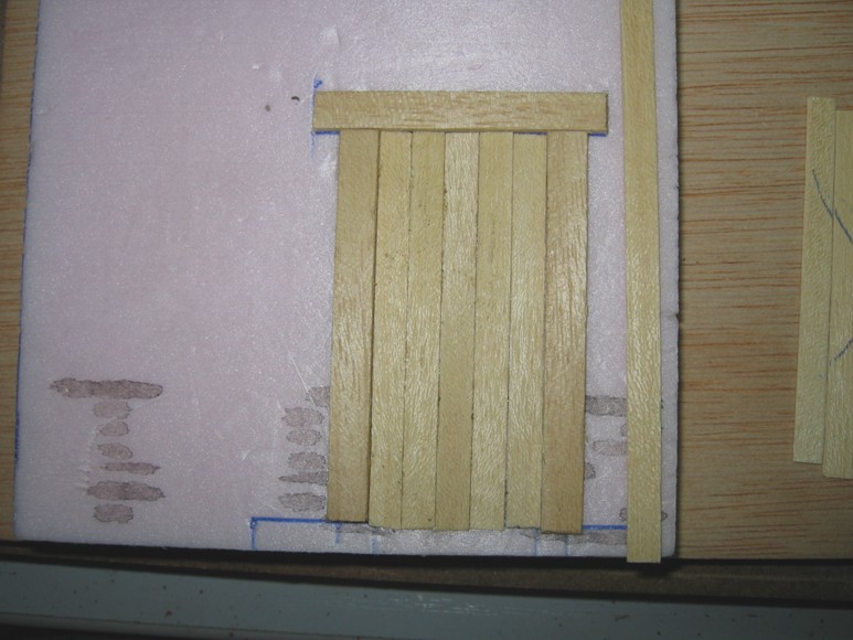 Para el marco de la puerta he utilizado tabla de 8 x 1 mm y para la tablazón de la puerta de 5 x 0,5 mm esta última conseguida del nº 1 coleccionable del Santísima Trinidad. Todo esta pegado con adhesivo de contacto. la puerta propiamente dicha esta hecha de 5 maderas de 0,5 total 2,5 de ancho, he dejado algo mas de espacio en el marco y así separar un poco las tablas para que se vean mejor al llenarse los huecos con el tinte. veris que hay un juego de las tablas marcado con una X, esto es para afinar los cantos de las tablas de otro lado y pegar el lado marcado.
