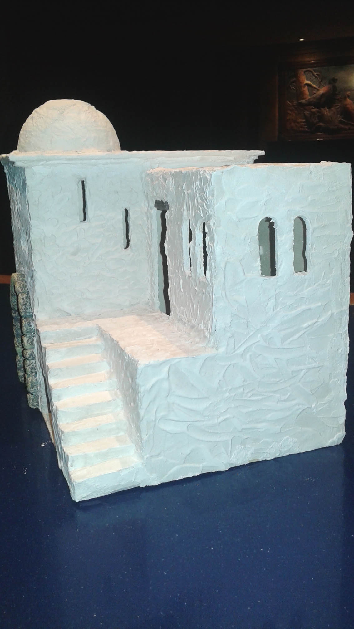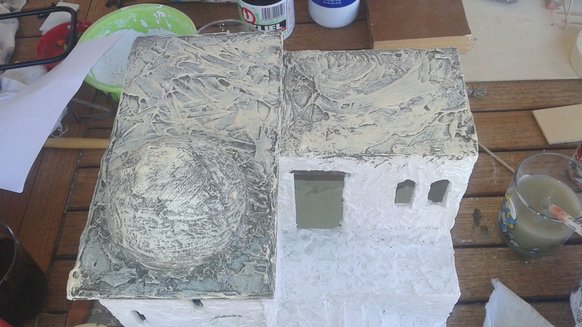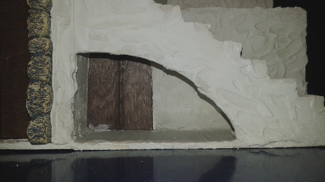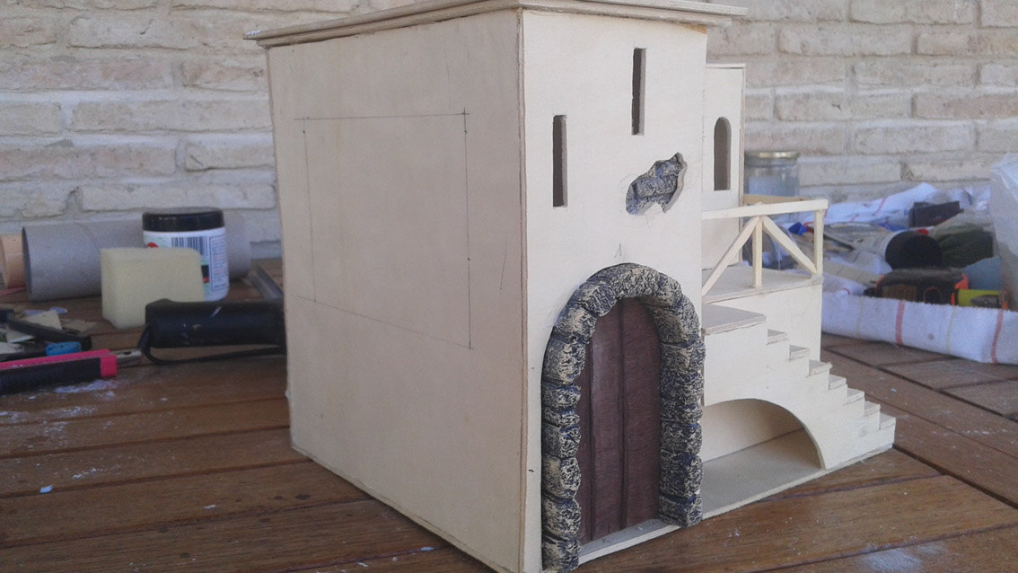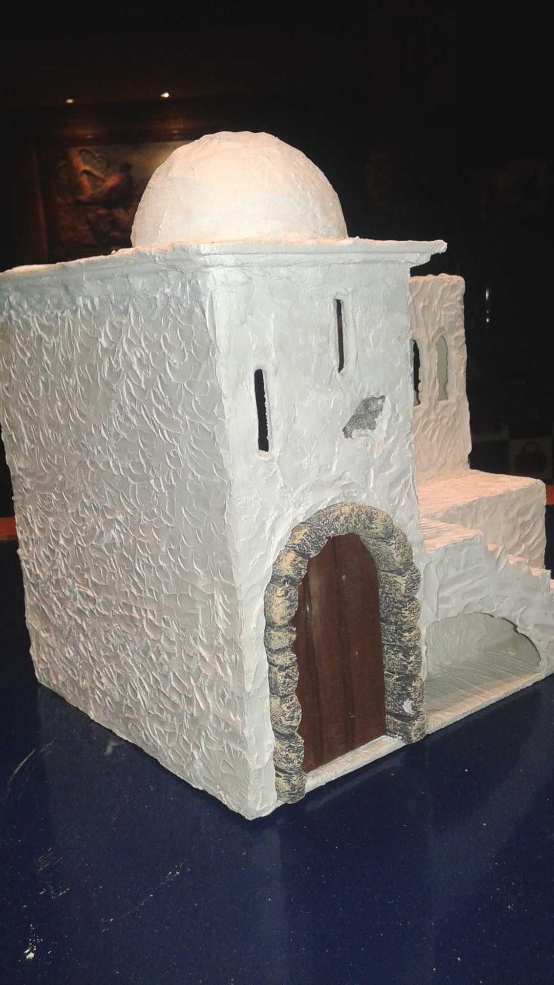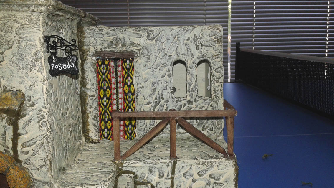Buenas tardes, ya con pensamientos navideños aquí os dejo fotos del montaje de mi posada para el belén de este año. La posada, está realizada con paneles, a escala 1:20 ( ya que mis figuras son de 8 cm de Oliver). Os explico un poco... Primero realicé sobre los paneles las cuatros vistas (frontal,trasera,laterales y la base). Una vez cortadas las pegué sobre la base con cola termofundible (silicona caliente de pistola). Ya que no disponía de poliestireno extrusionado para toda la posada, decidí hacerla en paneles y utilizar el poco porex que me quedaba para los desconchones, vigas y arcos. Una vez montada la posada entera realice sobre el porex dos arcos y dos vigas, los arcos están pintados con una base muy aguada de un gris muy oscuro y por encima una patina de ocre. Las vigas simplemente pintadas con marrón al agua para que no cubriese a todo por igual. Después de pegar los arcos y las vigas me dispuse a enfoscar mi posada con escayola y una espatulilla de bellas artes. Al acabar, hice una mezcla verde caqui oscuro (ocre+negro+pizca de azul) muy aguada que seria el color base de la posada con la que poco a poco fui dándole por partes. La realicé con un pincel plano del numero 2 y con un paño seco y limpio frotaba las partes superficiales para que me quedaran blancas y después una vez seca la base de fondo hice una veladura color crema muy claro (ocre+blanco) y con el mismo pincel seco fui patinando las partes superficiales. Una vez terminada de pintar, con el color verde caqui que me sobró hice las humedades, dejado caer una buena cantidad de pintura y que me quedó bastante bonito. Otra parte importante y que más tiempo me llevo fue realizar el balcón.