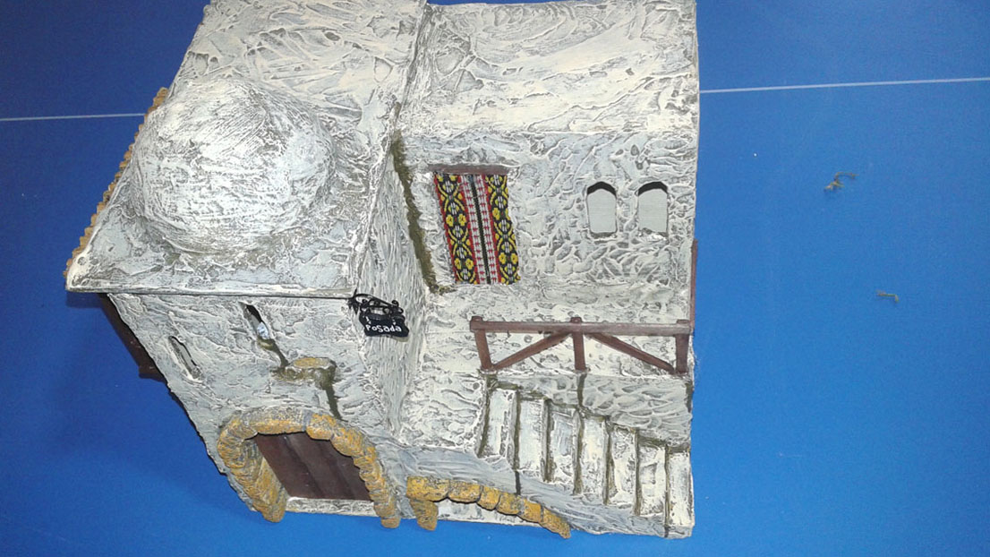 Buenas tardes, ya con pensamientos navideños aquí os dejo fotos del montaje de mi posada para el belén de este año. La posada, está realizada con paneles, a escala 1:20 ( ya que mis figuras son de 8 cm de Oliver). Os explico un poco... Primero realicé sobre los paneles las cuatros vistas (frontal,trasera,laterales y la base). Una vez cortadas las pegué sobre la base con cola termofundible (silicona caliente de pistola). Ya que no disponía de poliestireno extrusionado para toda la posada, decidí hacerla en paneles y utilizar el poco porex que me quedaba para los desconchones, vigas y arcos. Una vez montada la posada entera realice sobre el porex dos arcos y dos vigas, los arcos están pintados con una base muy aguada de un gris muy oscuro y por encima una patina de ocre. Las vigas simplemente pintadas con marrón al agua para que no cubriese a todo por igual. Después de pegar los arcos y las vigas me dispuse a enfoscar mi posada con escayola y una espatulilla de bellas artes. Al acabar, hice una mezcla verde caqui oscuro (ocre+negro+pizca de azul) muy aguada que seria el color base de la posada con la que poco a poco fui dándole por partes. La realicé con un pincel plano del numero 2 y con un paño seco y limpio frotaba las partes superficiales para que me quedaran blancas y después una vez seca la base de fondo hice una veladura color crema muy claro (ocre+blanco) y con el mismo pincel seco fui patinando las partes superficiales. Una vez terminada de pintar, con el color verde caqui que me sobró hice las humedades, dejado caer una buena cantidad de pintura y que me quedó bastante bonito. Otra parte importante y que más tiempo me llevo fue realizar el balcón.