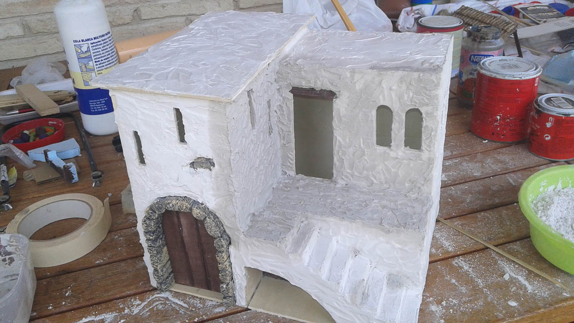Buenas tardes, ya con pensamientos navideños aquí os dejo fotos del montaje de mi posada para el belén de este año. La posada, está realizada con paneles, a escala 1:20 ( ya que mis figuras son de 8 cm de Oliver). Os explico un poco... Primero realicé sobre los paneles las cuatros vistas (frontal,trasera,laterales y la base). Una vez cortadas las pegué sobre la base con cola termofundible (silicona caliente de pistola). Ya que no disponía de poliestireno extrusionado para toda la posada, decidí hacerla en paneles y utilizar el poco porex que me quedaba para los desconchones, vigas y arcos. Una vez montada la posada entera realice sobre el porex dos arcos y dos vigas, los arcos están pintados con una base muy aguada de un gris muy oscuro y por encima una patina de ocre. Las vigas simplemente pintadas con marrón al agua para que no cubriese a todo por igual. Después de pegar los arcos y las vigas me dispuse a enfoscar mi posada con escayola y una espatulilla de bellas artes. Al acabar, hice una mezcla verde caqui oscuro (ocre+negro+pizca de azul) muy aguada que seria el color base de la posada con la que poco a poco fui dándole por partes. La realicé con un pincel plano del numero 2 y con un paño seco y limpio frotaba las partes superficiales para que me quedaran blancas y después una vez seca la base de fondo hice una veladura color crema muy claro (ocre+blanco) y con el mismo pincel seco fui patinando las partes superficiales. Una vez terminada de pintar, con el color verde caqui que me sobró hice las humedades, dejado caer una buena cantidad de pintura y que me quedó bastante bonito. Otra parte importante y que más tiempo me llevo fue realizar el balcón.