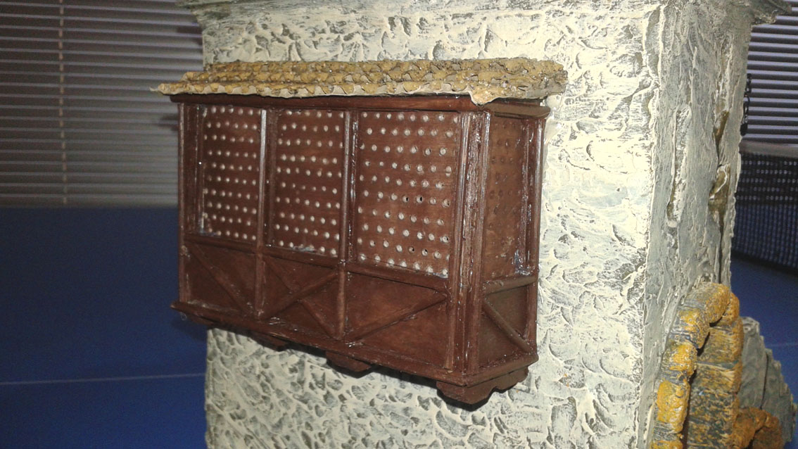 Realizado también con paneles, y con palillos finos de pinchitos. La celosía está realizada con panel y cuadriculada, con la dremel y una fresa fui realizando taladros. Todo el balcón pintado con marrón aguado.