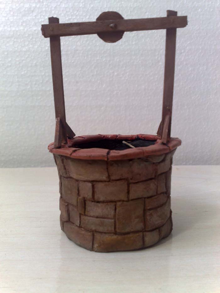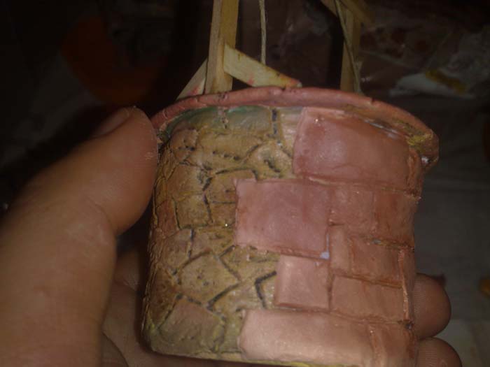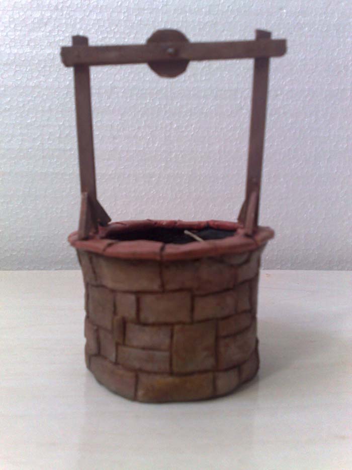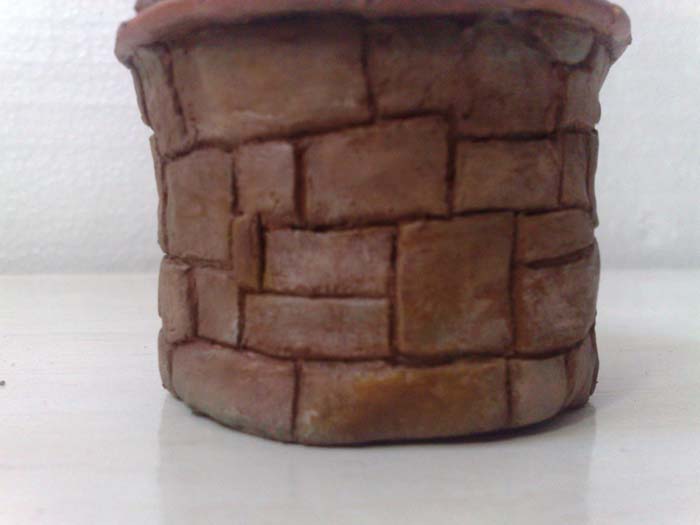 Bueno esactamente no es un paso a paso ya que no salen todos los pasos y partimos de una cosa a medio hacer que es un pozo que empece en barro y talle las piedras pero el resultado no me gusto asi que pense en pegarle losas de barro que fui cortandolas en cada momento y pegandolas con cola blanca, que han quedado muy fuertes, posteriormente di una mano de tinte marron castaño del que ponen los pintores para hacer colores con la pintura blanca y despues fui coloreando unas si otras no de diferentes tonos de marron hasta dar una mano de verde por el borde superior y el inferior, luego a pincel seco di una mano de color carne, que se mezclaba con parte del tinte castaño y di una mano de blanco y marque alguna piedra con algun tono mas marron, aun creo que no esta del todo terminado asi que si le hago alguna cosita mas ya lo pondre.