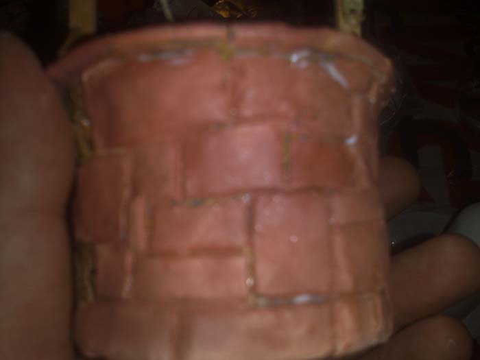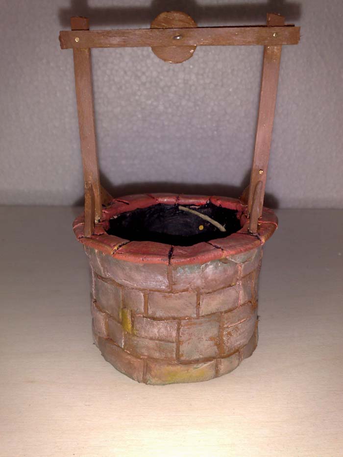 Bueno esactamente no es un paso a paso ya que no salen todos los pasos y partimos de una cosa a medio hacer que es un pozo que empece en barro y talle las piedras pero el resultado no me gusto asi que pense en pegarle losas de barro que fui cortandolas en cada momento y pegandolas con cola blanca, que han quedado muy fuertes, posteriormente di una mano de tinte marron castaño del que ponen los pintores para hacer colores con la pintura blanca y despues fui coloreando unas si otras no de diferentes tonos de marron hasta dar una mano de verde por el borde superior y el inferior, luego a pincel seco di una mano de color carne, que se mezclaba con parte del tinte castaño y di una mano de blanco y marque alguna piedra con algun tono mas marron, aun creo que no esta del todo terminado asi que si le hago alguna cosita mas ya lo pondre.
