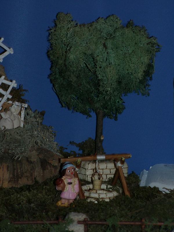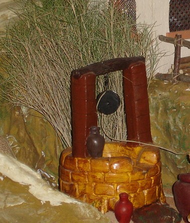 No se aprecian muy bién los detalles pero puede servir. La polea se apoya en troncos naturales de un ficticio árbol. El cubo con chapa de aluminio de una lata de refresco y adjunto al propio pozo hay un pilón.