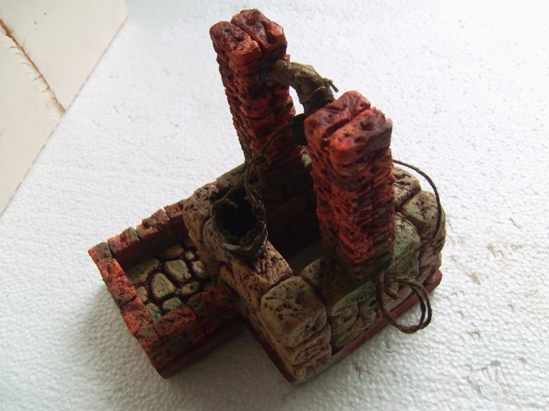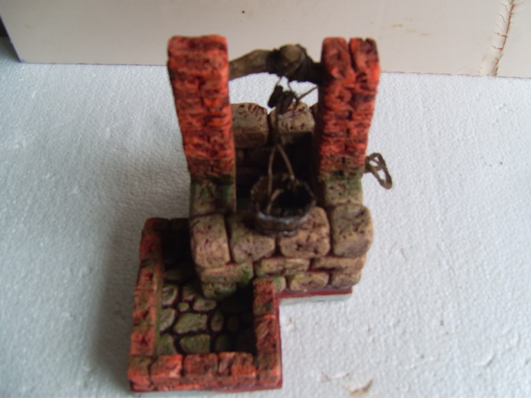Hola amigos belenistas. Aquí os presento éste mi primer pozo que con toda ilusión ubicaré en el belén, ya tan próximo. En las fotos 1 y 2 se puede apreciar que los elementos del pozo los saqué de plancha de pórex estrusionado de 3 cm. de grosor, y las diversas herramientas que necesité. En la foto 3 indico que usé pintura de base rojo inglés y también pintura de caucho líquida para impermeabilizar el abrevadero, ya que este llevará agua. Como se aprecia, las dos pinturas son indistinguibles, con lo que se consigue uniformidad. En la foto 4 se percibe ya la pintura final, tanto de piedras como de ladrillos, conseguida a base de veladuras y pincel seco. En las restantes fotos se ve el resultado final, tras el pegado de las piezas y el aditamento de los complementos: polea, cubo, cuerdas...