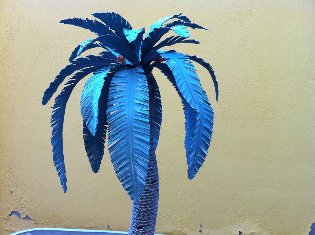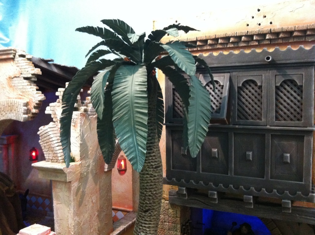 Pozo precioso donde los haya, En cuanto a la palmera cimbreante, no se. todavía no he visto en la naturaleza una así,. Las palmeras crecen según el sol y las sombras de alrededor. Toman una dirección y crecen en la misma siempre, salvo que las trasplantes cerca de una casa y le moleste al crecimiento. De todas formas. Es muy bonita, las hojas están muy logradas enhorabuena.