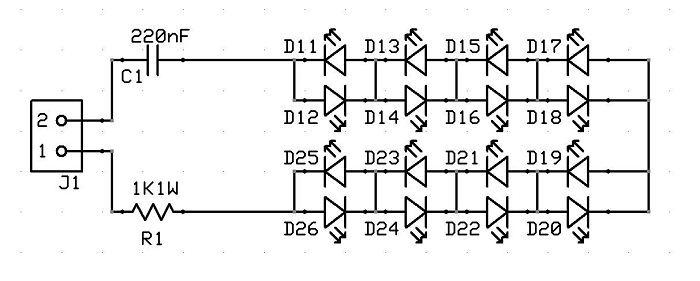Las líneas que están en azul son conexiones. En realidad el montaje es algo así como "varias parejas de leds en antiparalelo montadas en serie". Por eso debes montar 2, 4, 6, 8... leds. Con un número impar no vale.