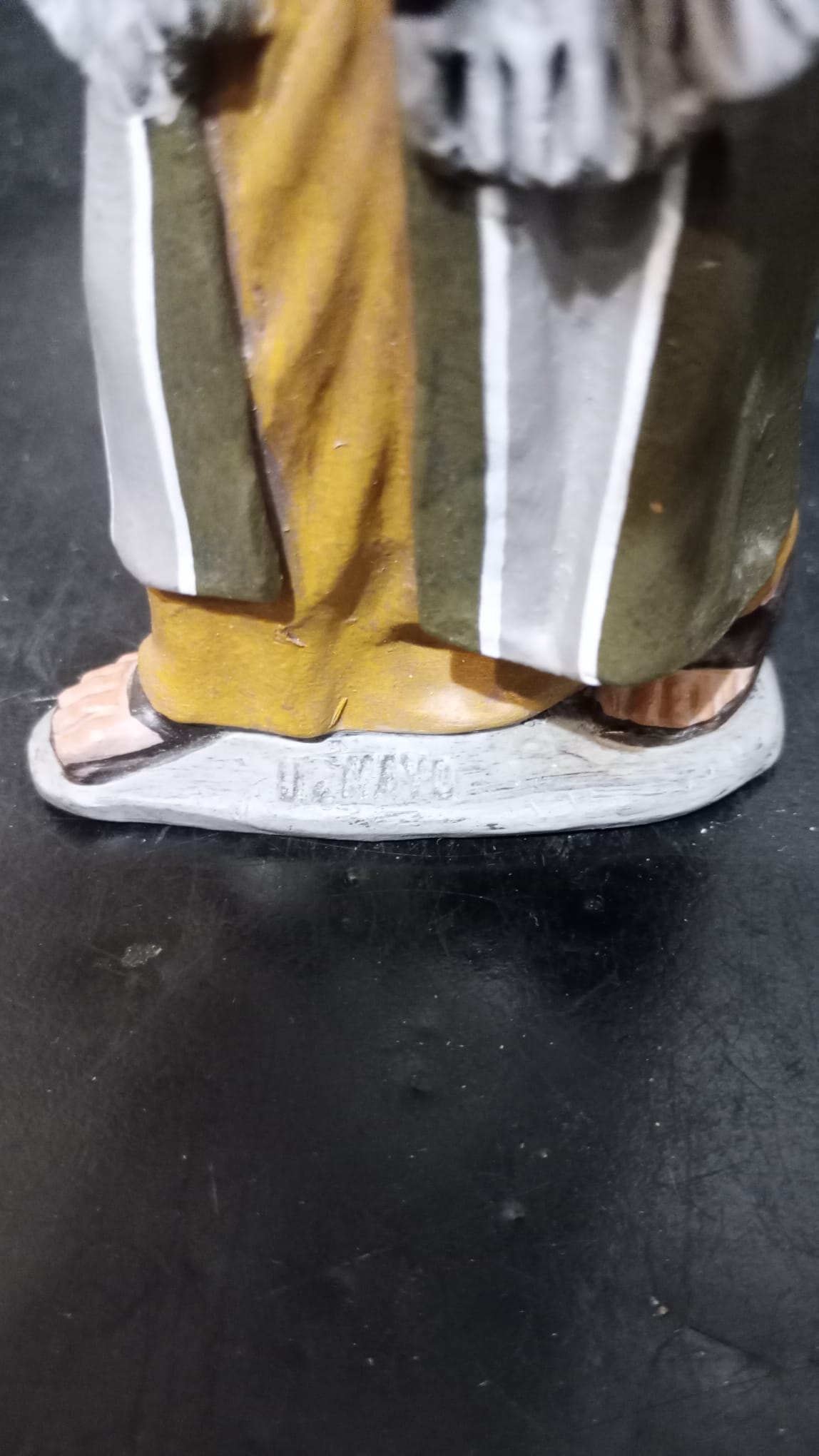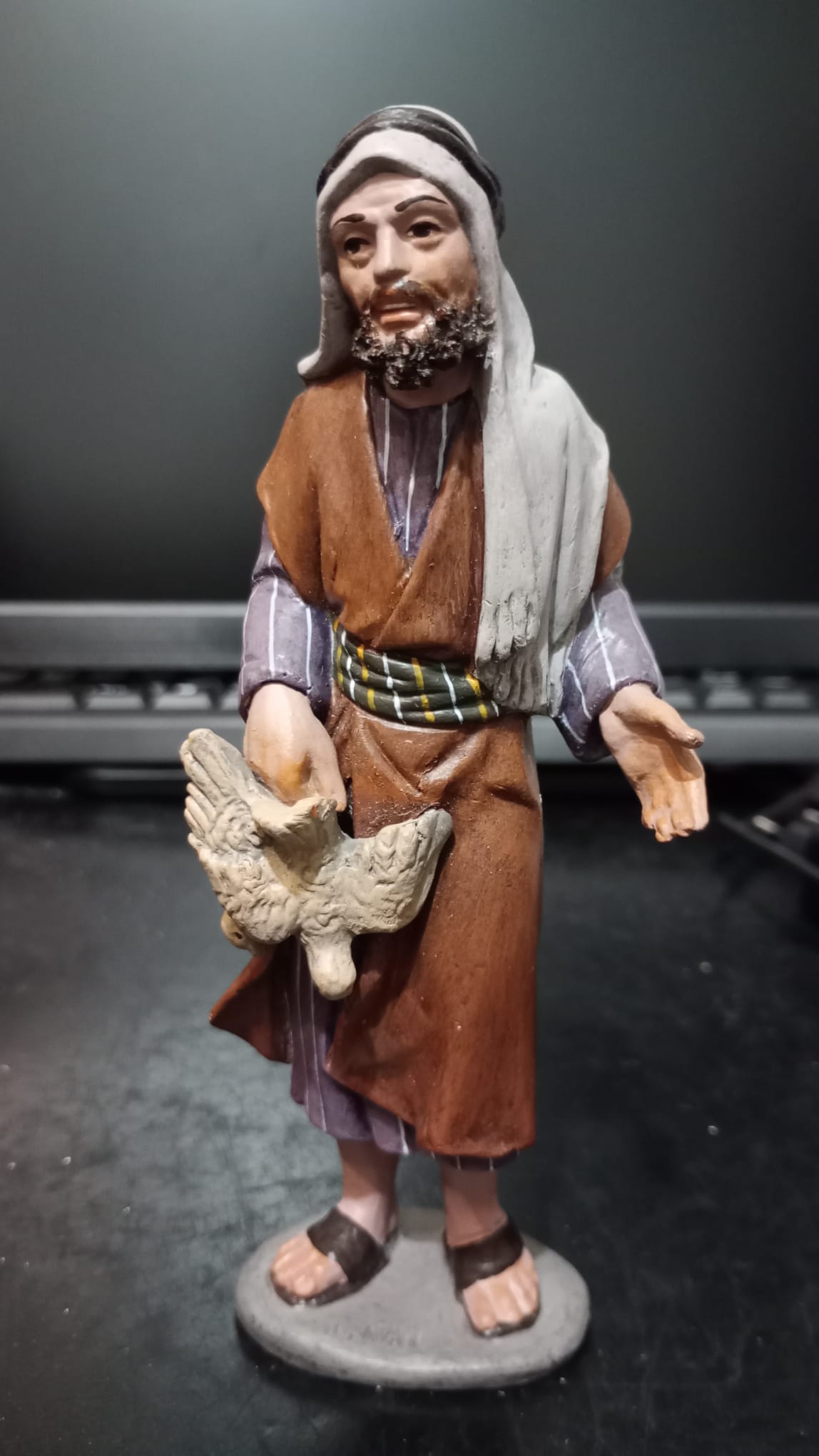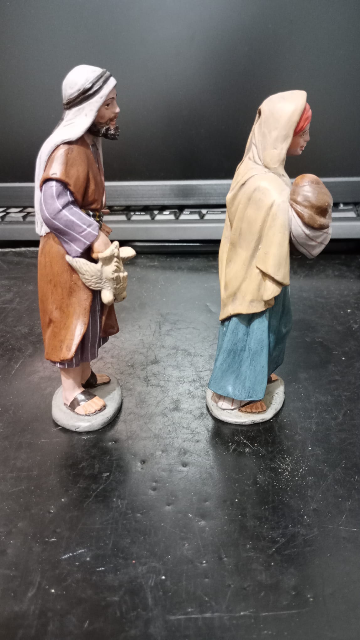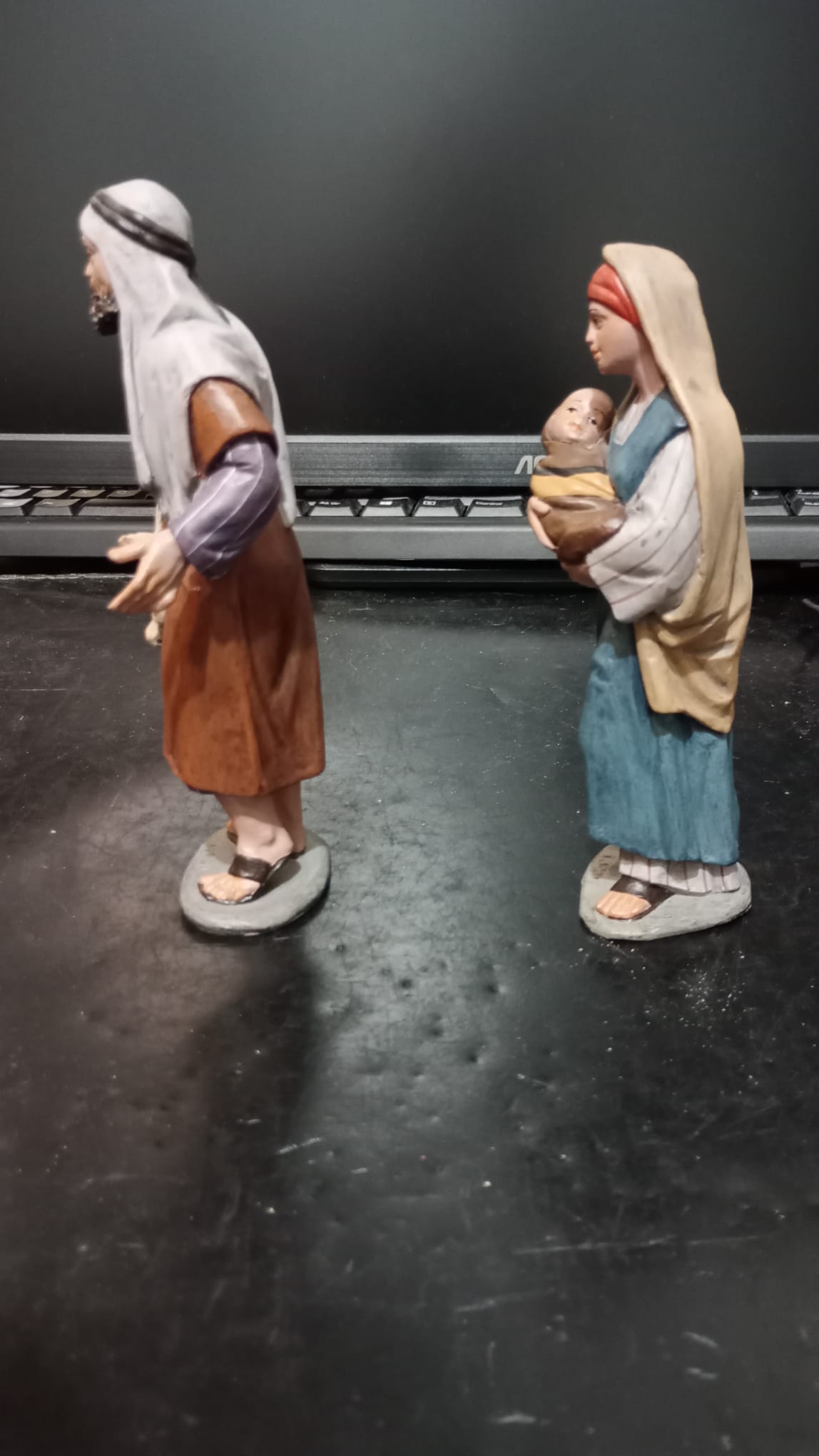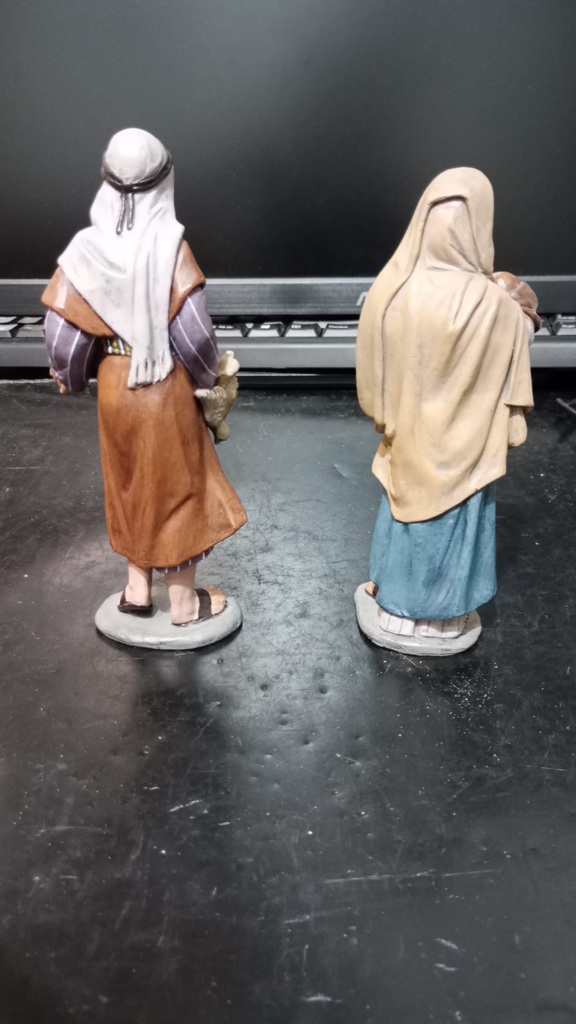 Tres figuras nuevas de 16cm de José Luis Mayo en barro. Para presentación en el templo: Sacerdote, San José con las tórtolas y Virgen con niño. También uso como pastores. Se vende sólo el lote completo.