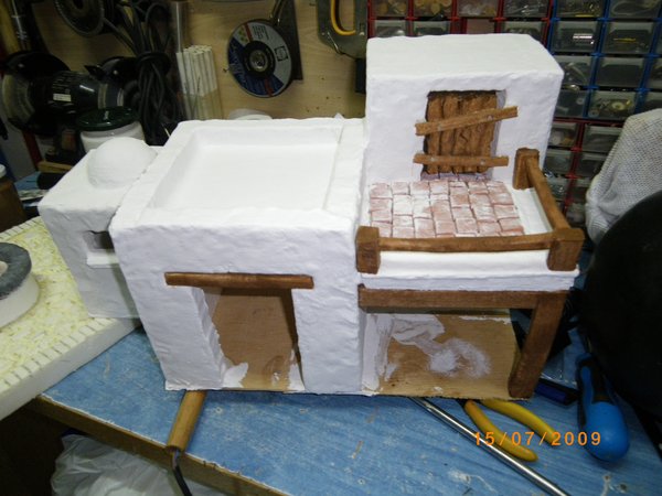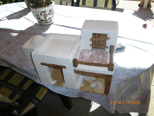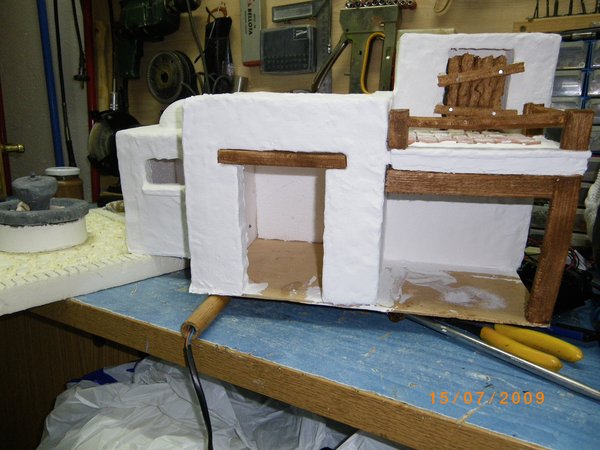 7º Es el turno de la madera. Con poliestireno extruido, el duro, con el soldador, cuter y lijas se le dan forma a las vigas y puertas. El pintado, esta realizado con un barniz que tenia de pintar la mesa del jardin.